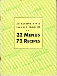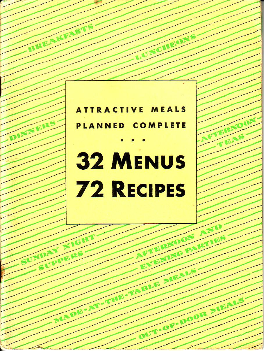 Next up, from 1931, “Attractive Meals Planned Complete, 32 Menus, 72 Recipes.” I snagged this one because I always struggle to come up with menus. It’s actually published by the Rumford baking powder company (and Rumford baking powder, at least, is still available) with a short foreword by Ann Batchelder. The cover, I’m afraid, is nothing special: