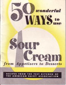 Finally, “50 Wonderful Ways to Use Sour Cream, from Appetizers to Desserts” (from the Western New York Milk Producers Cooperative Association, Inc.) is, I think, from the 1950s, but it should be handy to have some ideas around for using up the other half of the container of sour cream I bought for some recipe or other.