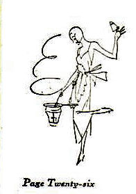 There are also charming little line drawings on many of the pages – not all as odd as this one, with its evening-gown-clad cook at work – and color illustrations of food. Here’s one of the booklet’s suggested luncheon menus: Eggplant Souffle (a misnomer, it’s more of a casserole), Rolls and Butter, Tomato and Cucumber Salad (with Kraft Kitchen Fresh French Dressing), Cookies, and Coffee.
