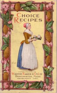 Next, “Choice Recipes,” 1916, from Walter Baker & Co. Ltd., with a nice partly embossed cover. The inside title pages says “Chocolate and Cocoa Recipes by Miss Parloa, Home Made Candy recipes by Mrs. Janet McKenzie Hill,” but I actually counted seven major contributors to this booklet, including Fannie Merritt Farmer, and there were several recipes attributed to single individuals as well.