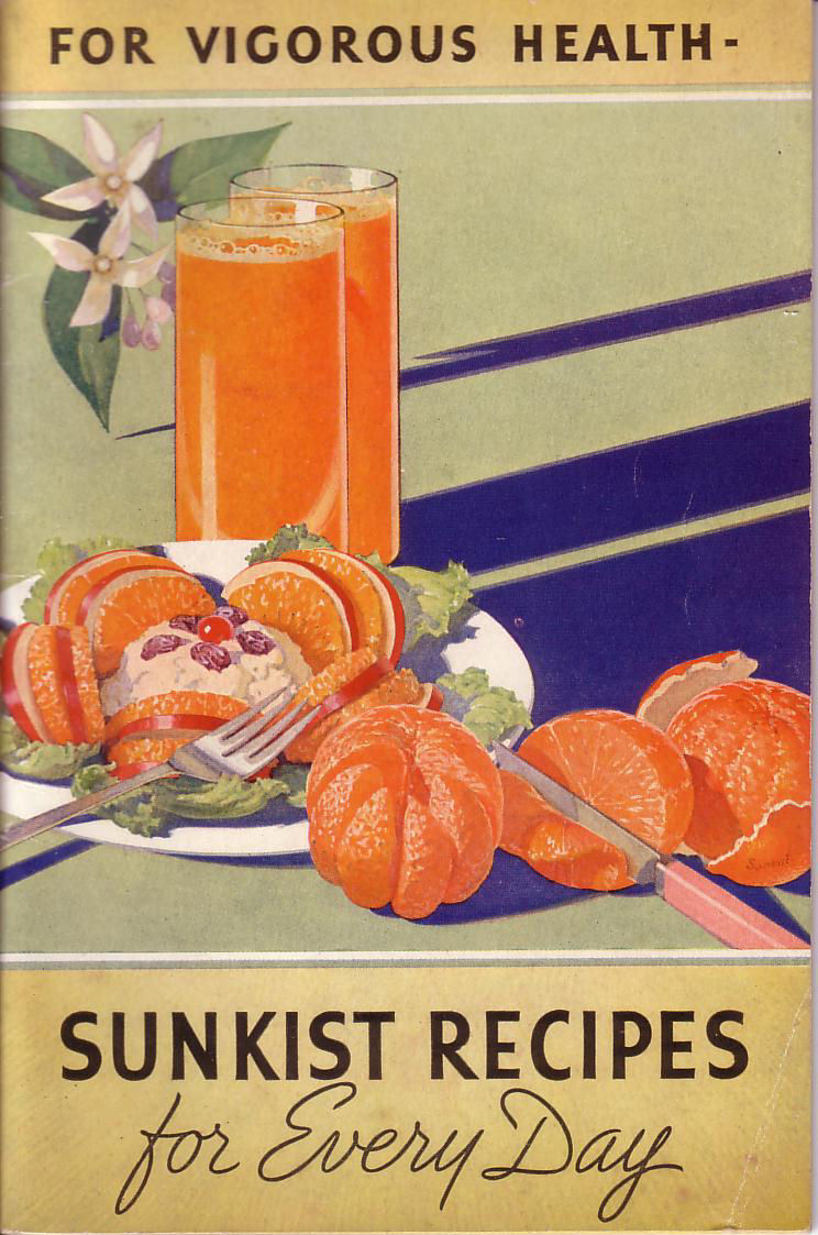 I’m pairing this one with 1936’s “For Vigorous Health – Sunkist Recipes for Every Day,” published by the California Fruit Growers Exchange of Los Angeles, California. It includes recipes of every kind – a page devoted to Baked Oranges; breads; appetizers; salads and salad dressings; main courses; drinks; and desserts. Then there’s the menu guide (different meals, child’s diet, reducing diet, invalid diet), suggestions and hints for entertaining, place settings for breakfast, luncheon, and dinner; and household uses for lemons. All this in only 48 pages (including index)!