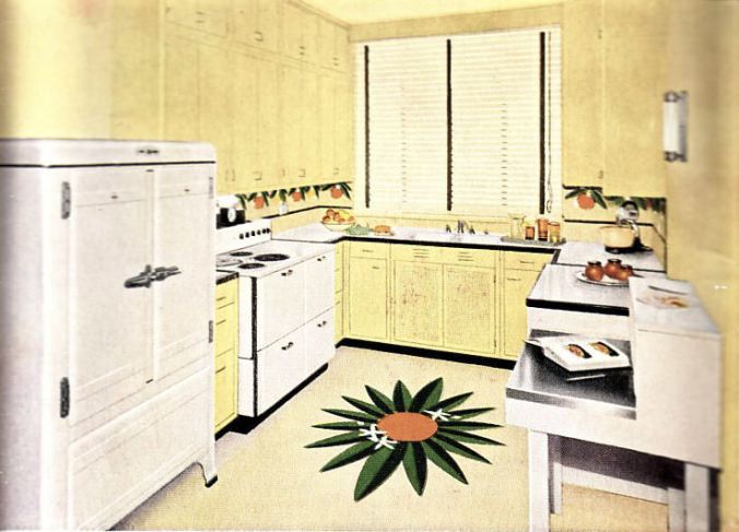 There’s also a picture of “The New Sunkist Kitchen,” which I’ve scanned as an example of a top-of-the-line kitchen for 1936 – complete with ice chest and what looks like an electric stove. And decorated with oranges, of course.
