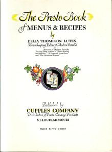 Presto was (and is!) a canning jar company.  The booklet has a section about canning methods and equipment, followed by seasonal menus and recipes, followed by a section on meal planning and nutrition.  The recipes, not surprisingly, rely on canned foods mostly.  Whether they’re any good I can’t say (yet).