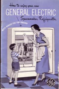 Finally, we have an entry from about 1950, “How to enjoy your new General Electric Spacemaker Refrigerator,” from the General Electric Company Consumers Institute in Bridgeport, Connecticut. The housewife no longer needed to be convinced that a refrigerator was a good investment, but the back cover stated that “The Consumers Institute stands ready to show you the way to better health through new and improved methods of food preparation and preservation.”