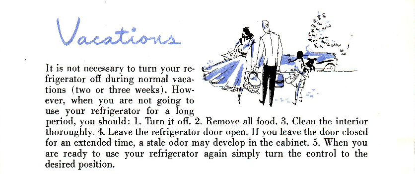 I also scanned this little section about refrigerator care, mainly for its illustration and for its blithe assumption that the reader would normally have two or three weeks’ vacation. Such a charming and dated idea, no?