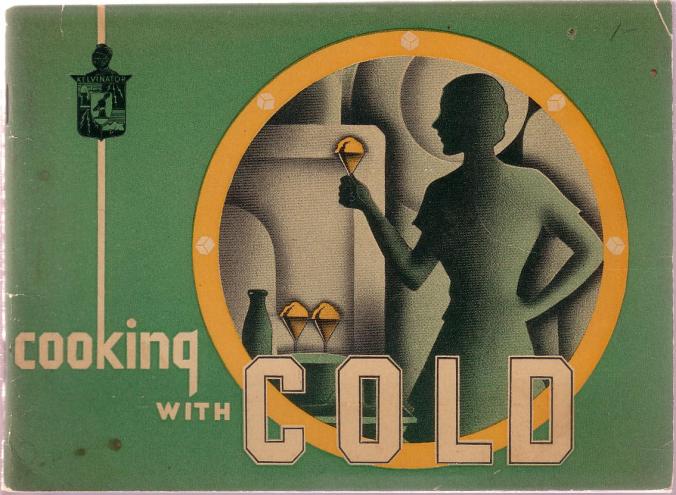 Our first item is from 1933: “Cooking With Cold” by the Kelvin Kitchen section of Kelvinator Sales Corporation of Detroit, Michigan. It’s a beautifully designed booklet in what must have been called the “Modern” style (notice the ice cubes in the yellow circle on the cover, here). It includes instructions on how to store food in a refrigerator, as well as a two-page treatise on how the housewife’s quest “for equipment which will enable her to take care of the physical needs of her family in accordance with the ever-increasing knowledge and information which modern science is placing at her disposal,” and also save her time, is like a treasure hunt.