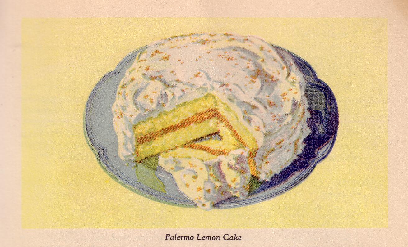 For a recipe I’m going with “Palermo Lemon Cake” – the picture looks tasty, doesn’t it? The cake recipes in this booklet have the interesting feature of specifying how many eggs are needed, in bold type right under the recipe name; I’m not sure why.