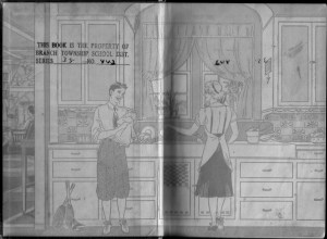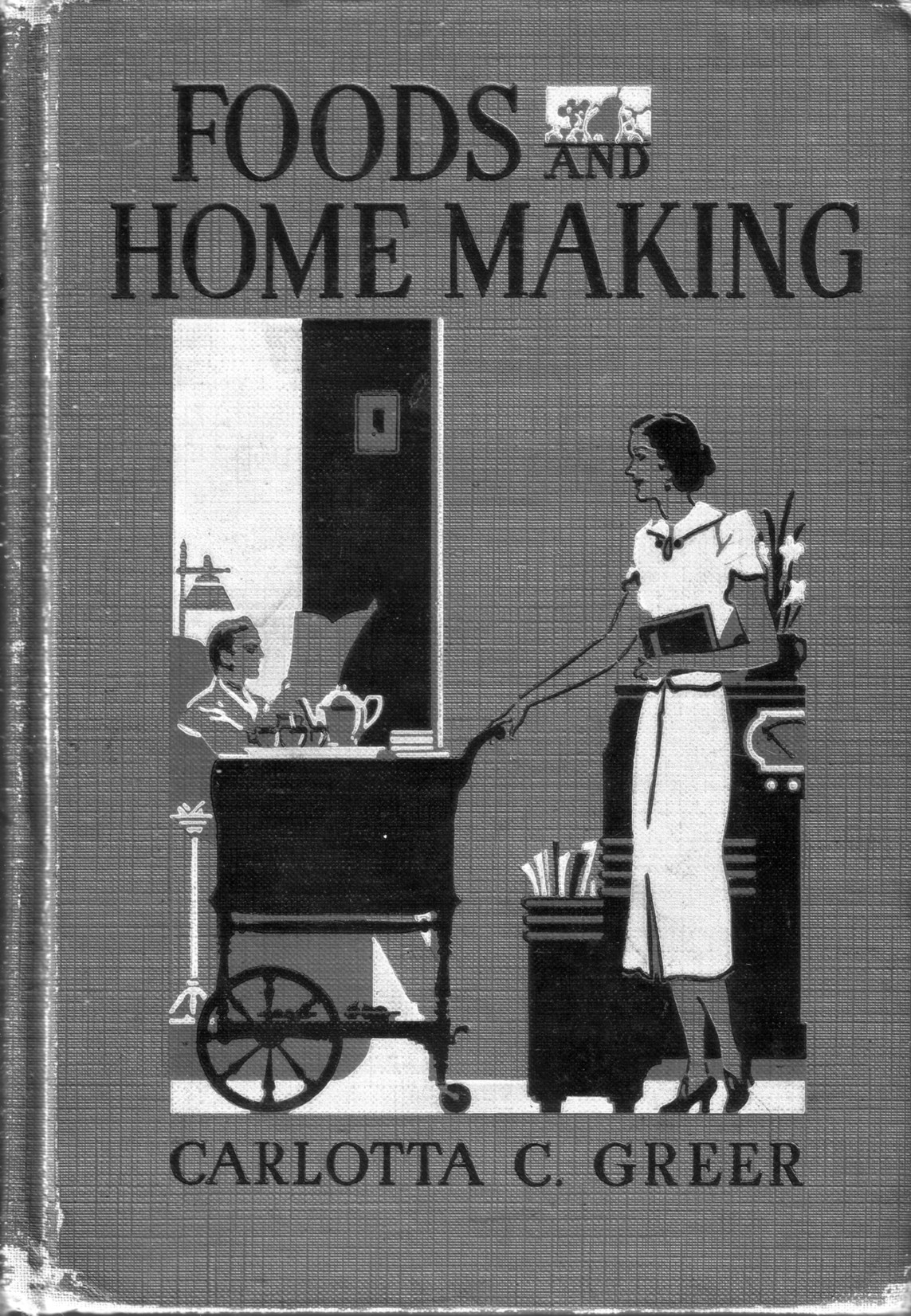 At the flea market today I picked up Foods and Home Making by Carlotta C. Greer, revised edition, published in 1937. Ms. Greer was the head of the department of home economics at John Jay High School in Cleveland – in other words, part of the home economics movement that has lost so much steam in recent decades. Notice the nice Art Deco detailing on the radio cabinet in the cover picture, and the fact that Mrs. Homemaker is carrying along a book to read while Mr. Moneybags reads the paper and they both take tea. Like most (if not all) of the home economics movement, this text is devotedly and unquestioningly middle class. Consider, also, the picture on the inside cover:
