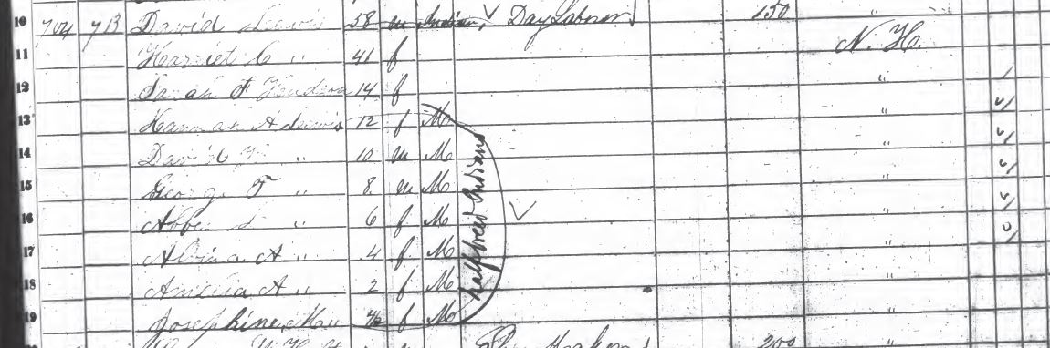 I’ve been skimming a lot of 1860 census pages lately, and one thing I’ve noticed is that despite the detailed instructions, the census marshals still have to exercise judgment in a number of areas. Since I’m focusing on African-Americans, I’ve noticed that some marshals didn’t identify any mixed-race people (known as “mulattoes” to the Census). Some of them also classified people as “Indian” (meaning Native American) even though that isn’t one of the three accepted “color” designations (which were Black, Mulatto, and White). In one case, the marshal identified several members of a family as “Ind” (for Indian) but did not count them as “colored” in the tally at the bottom of the sheet (making him different from others who did consider Indians colored).